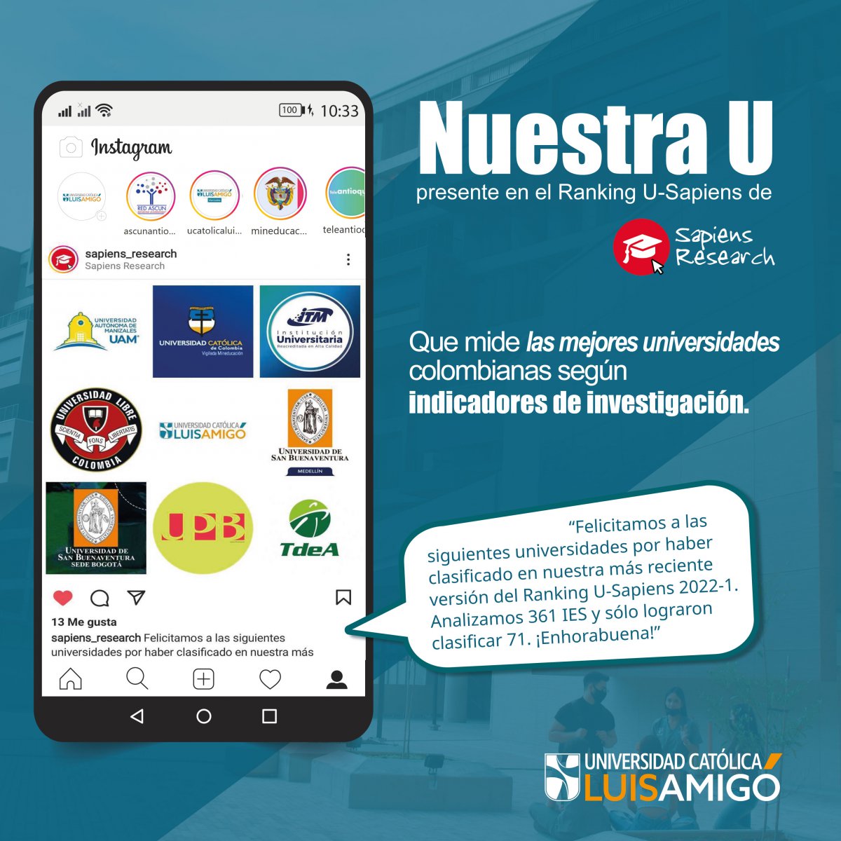 El pasado 23 de mayo, Sapiens Research publicó los resultados del Ranking U-Sapiens, la clasificación de las mejores Instituciones de Educación Superior del país según indicadores de investigación, donde la Universidad Católica Luis Amigó ocupó el puesto 51, convirtiéndose en la única Institución de Educación Superior no acreditada de la ciudad de Medellín en obtener este reconocimiento.