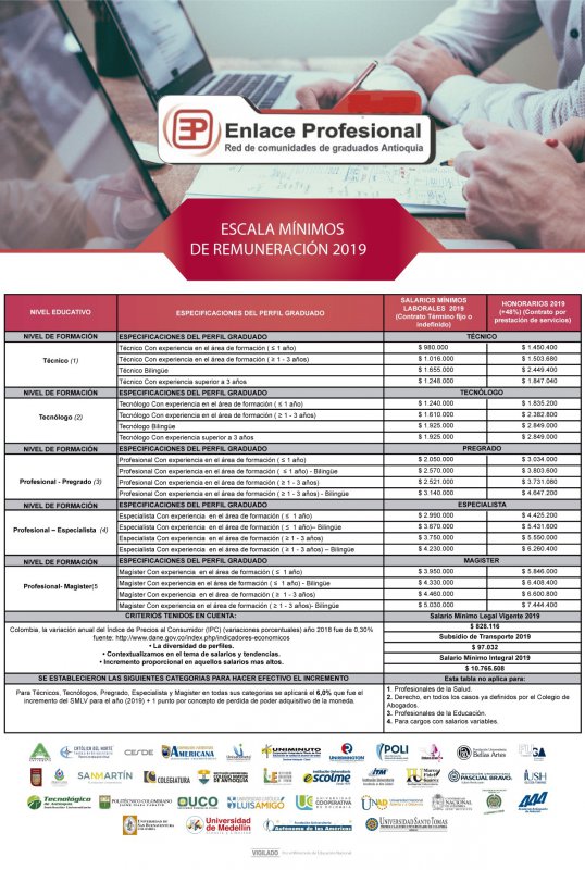 Tabla 2019 de mínimos de remuneración para los profesionales de Antioquia